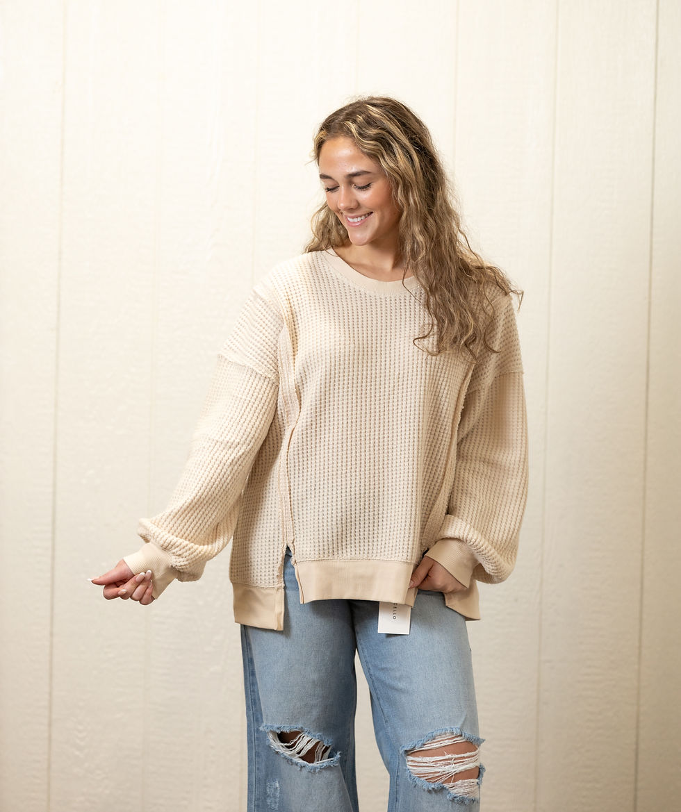 A soft oversized waffle knit designed with a relaxed silhouette and drop shoulders for an effortless, lived-in feel. Finished with raw edge details, a round neckline, and subtle side slits that create movement. The perfect throw-on piece for casual comfort while still looking put-together.